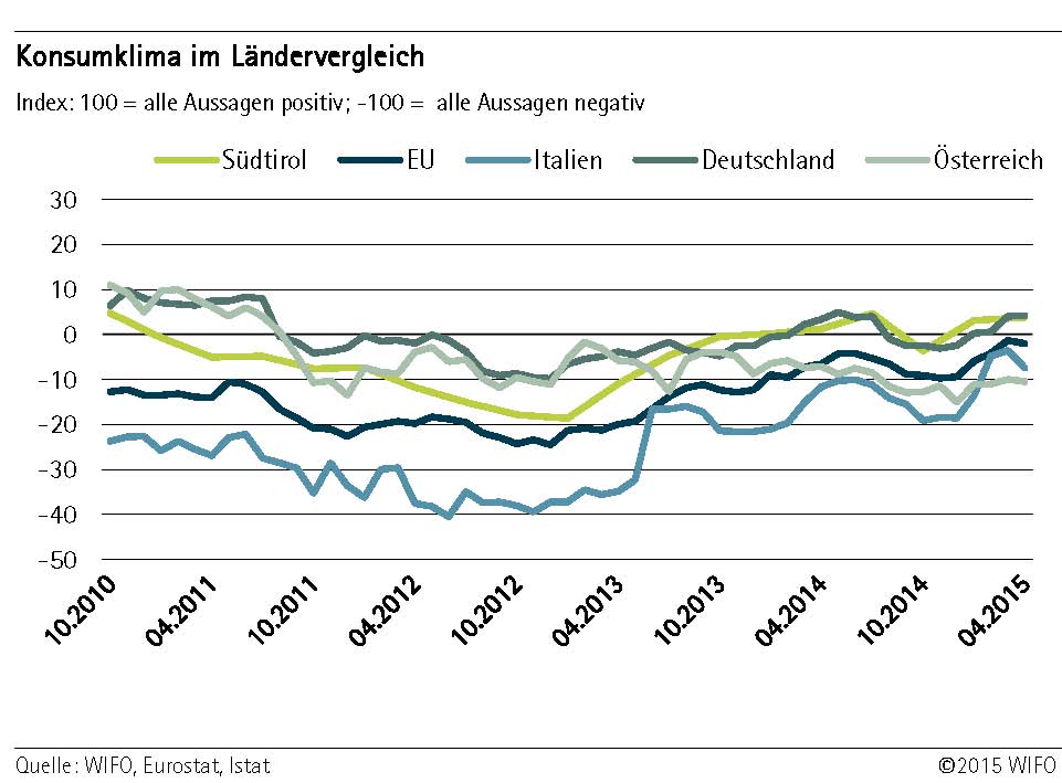 Das Vertrauen der Südtiroler Konsumenten ist das dritte Quartal in Folge angestiegen. Das geht aus der Konsumentenbefragung des WIFO – Institut für Wirtschaftsforschung der Handelskammer Bozen hervor. Damit nähert sich der entsprechende Indexwert für April wieder den Werten von 2010 an. Das Konsumklima befindet sich in Südtirol auf dem gleichen Niveau wie in Deutschland und ist im europäischen Vergleich überdurchschnittlich.
