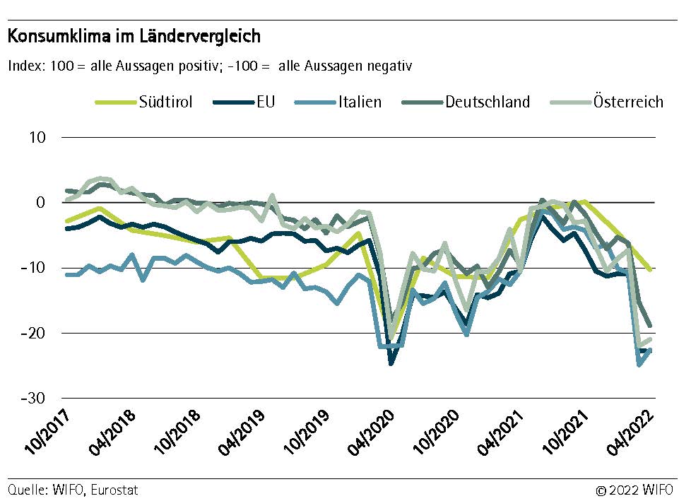Die Verschlechterung des Konsumklimas in Südtirol ist jedoch geringer als im europäischen Durchschnitt. Im April lag der Indexwert für die Europäische Union (EU27) bei -22,8 Punkten, was einem Rückgang von 11,9 Punkten im Vergleich zum Jänner entspricht. In Italien lag der Index mit -22,6 Punkten auf einem ähnlichen Niveau und war damit etwas schlechter als in Österreich (-21,0) und in Deutschland (-18,9).