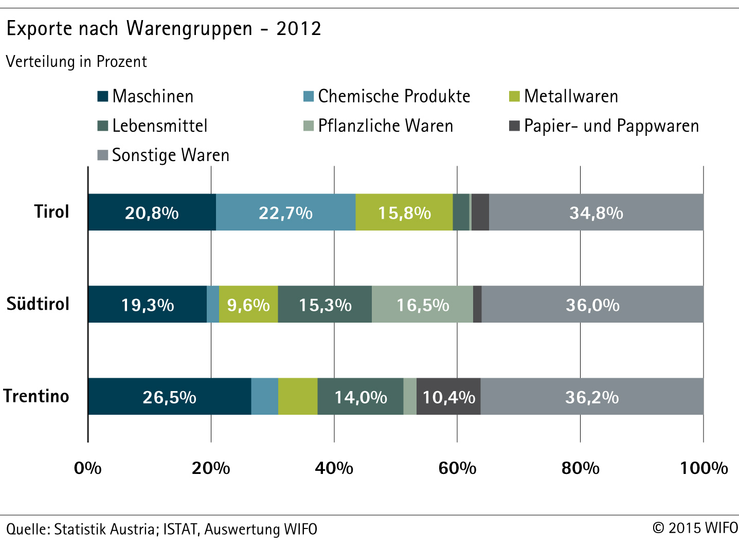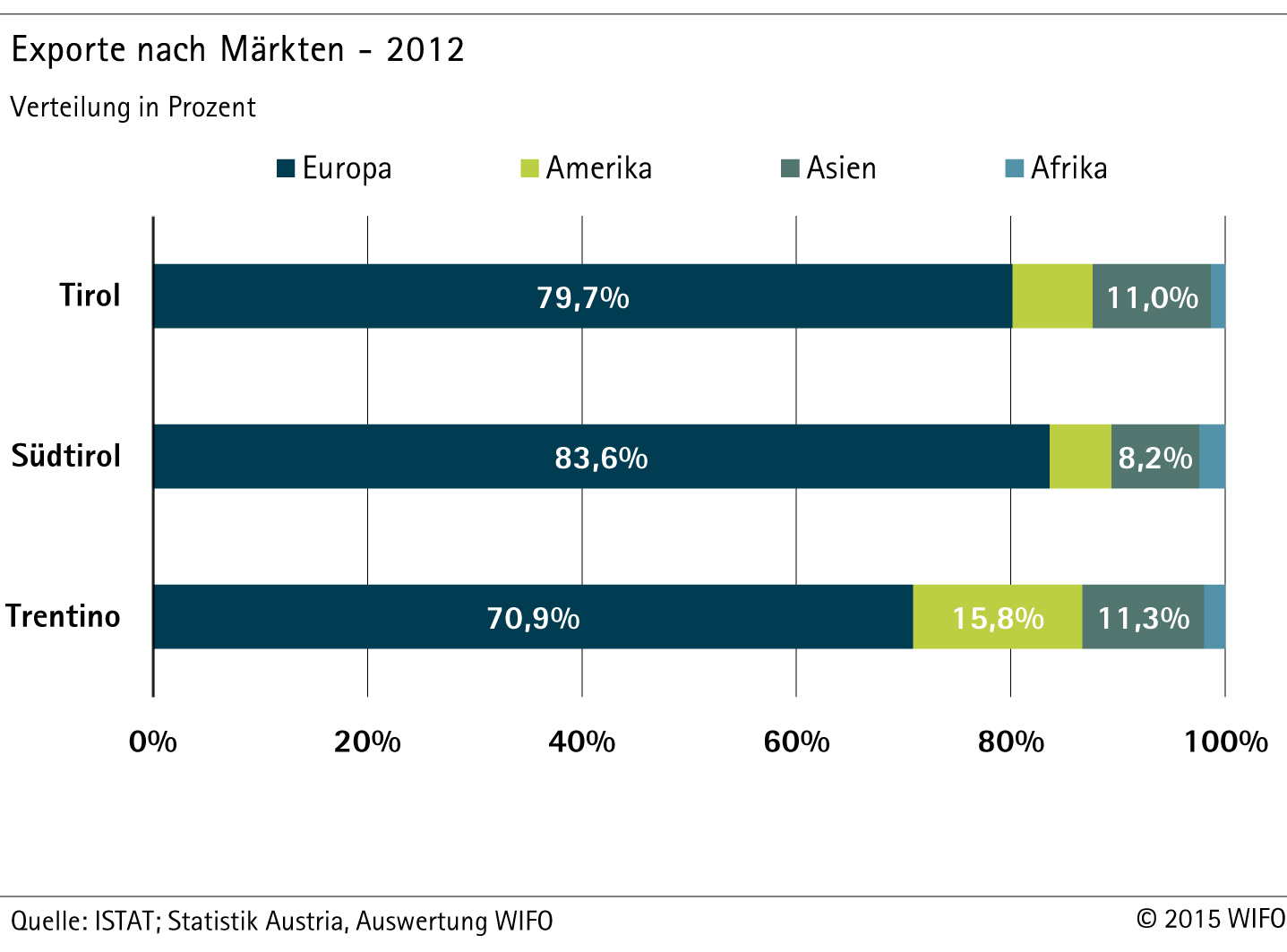 Das WIFO – Institut für Wirtschaftsforschung der Handelskammer Bozen hat in Zusammenarbeit mit der Handelskammer Trient und der Wirtschaftskammer Tirol die Exportstruktur der Europaregion Tirol-Südtirol-Trentino unter die Lupe genommen. Tirol, die größte Volkswirtschaft der drei Länder, exportiert Waren im Wert von rund 11 Milliarden Euro (Jahr 2013), Südtirol 3,9 (2014) und das Trentino 3,3 (2014) Milliarden Euro. Am Beispiel Südtirol zeigt sich, dass fast 10 Prozent der gesamten Wertschöpfung sowie über 11 Prozent der Gesamtbeschäftigung, direkt oder indirekt, vom Export abhängen (Jahr 2010).