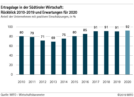 Im Vergleich zur vorherigen Konjunkturerhebung im Sommer sind die Ertragserwartungen für das laufende Jahr im verarbeitenden Gewerbe und im Gütertransport leicht gesunken. Diese Bereiche sind von der schwächelnden Weltwirtschaft am stärksten betroffen. Andererseits haben sich die Einschätzungen der Tourismus-, Einzelhandels- und Bauunternehmen gebessert. Für 2020 wird in den meisten Sektoren eine Steigerung der Rentabilität erwartet.