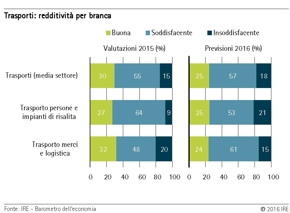 Nel settore dei trasporti il clima di fiducia continua a essere positivo: quest’anno l’82 percento delle imprese conta di conseguire redditi soddisfacenti. I fatturati sono in aumento sia per il trasporto di passeggeri, sia per la logistica e il trasporto di merci. Ciò ha riflessi positivi sull’occupazione: nel primo semestre 2016 il numero di lavoratori dipendenti nel settore dei trasporti è aumentato del 3,6 percento rispetto allo stesso periodo del 2015.
