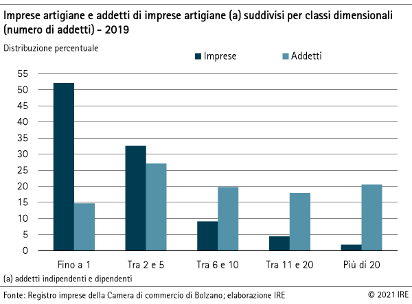 Oltre un terzo delle imprese produttive e circa un quinto di tutti gli occupati in Alto Adige (escluso il settore agricolo) fanno capo al settore dell’artigianato. L’artigianato altoatesino comprende una gamma molto vasta di attività: ad oggi vengono praticati ben 406 mestieri diversi, anche se molte attività sono svolte esclusivamente da una o poche imprese. I mestieri più importanti - in base al numero di imprese - sono i muratori con 1.179 imprese, i parrucchieri (729), gli elettricisti (681) nonché i pittori e verniciatori (680). Con una media di 3,3 addetti per impresa, l’artigianato altoatesino è caratterizzato da imprese di piccole dimensioni. Fanno eccezione le panetterie e le macellerie con rispettivamente 17,7 e 10,2 occupati per impresa. Rispetto al 2010, l’età media degli imprenditori e delle imprenditrici è aumentata: oltre la metà ha superato i 50 anni.