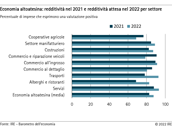 Il 2022 è iniziato con ulteriori difficoltà, causate dalla ripresa dei contagi in seguito alla diffusione della variante Omicron. Nonostante l’impatto sulle attività economiche sia stato decisamente più contenuto rispetto alle ondate pandemiche precedenti, vi è stato comunque un effetto negativo sui flussi turistici e sull’attività delle imprese, soprattutto quelle di minori dimensioni, a causa dei molti lavoratori costretti alla quarantena. La rilevazione congiunturale condotta dall’IRE a febbraio evidenzia quindi uno scenario di grande incertezza, tanto che il 15 percento delle imprenditrici e degli imprenditori intervistati ha ritenuto di non poter formulare una previsione riguardo alla redditività della propria azienda nel 2022. Occorre tuttavia considerare che la rilevazione si è conclusa prima dello scoppio della guerra in Ucraina e dei conseguenti rincari di energia, gas e carburanti, che impattano negativamente sull’economia. In considerazione delle notevoli tensioni sui mercati dell’energia e delle materie prime, lo scorso marzo l’IRE ha rivisto al ribasso la previsione di crescita per il 2022, che dovrebbe pertanto attestarsi tra il tre e il quattro percento.