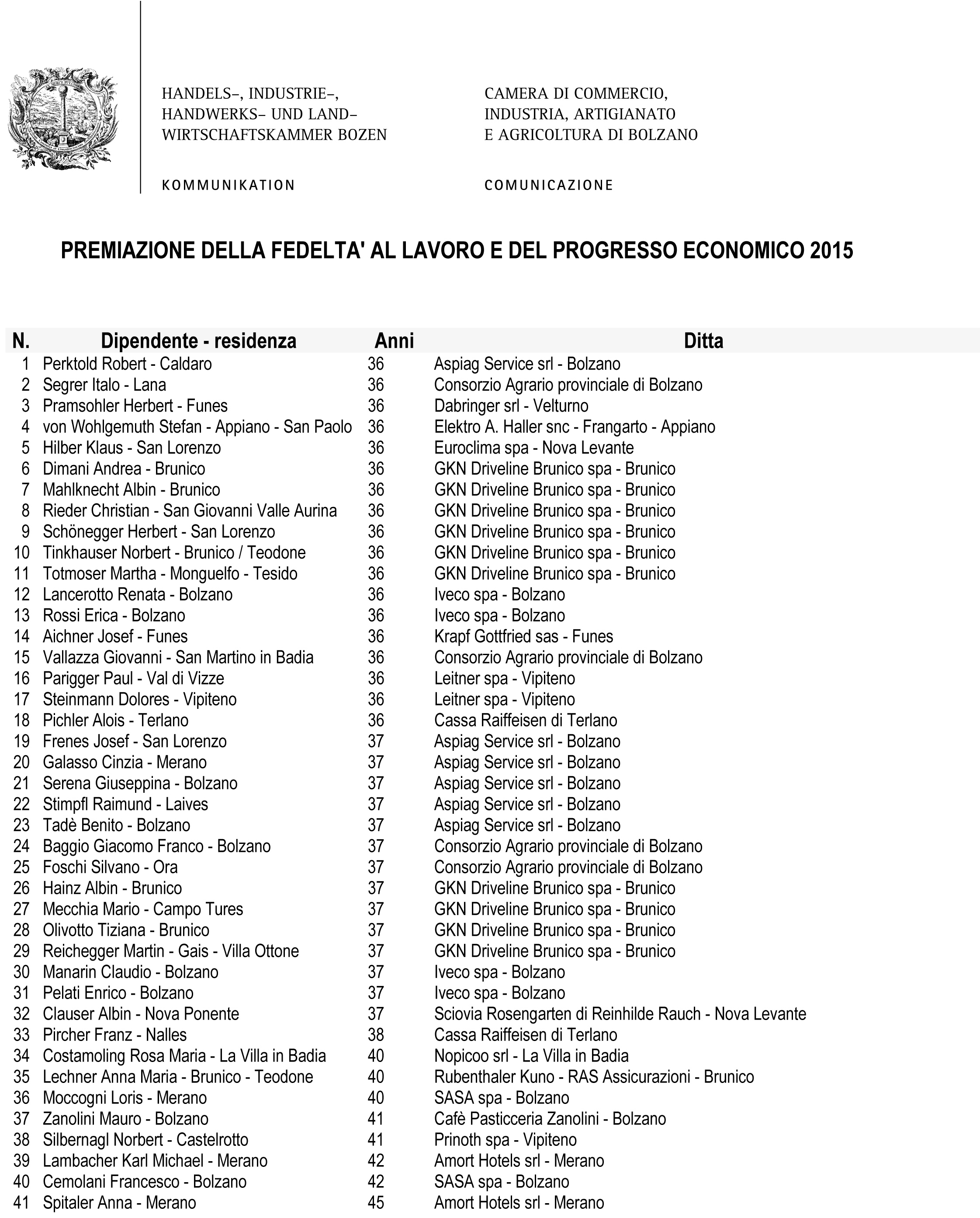 Quest’anno l’impresa altoatesina con la tradizione più lunga è il Panificio Lemayr S.r.l. della famiglia Pellegrini di Bolzano. Sandro Pellegrini è membro della Giunta esecutiva dell’Unione commercio turismo servizi Alto Adige. Il Panificio vanta ben 214 anni di storia. Sono stati insigniti inoltre la Falegnameria Gaiser S.n.c. di Gaiser Georg & Co. di Appiano che quest’anno festeggia 129 anni di attività e l’albergo Hotel Vinschgerhof del Presidente dell’Associazione Albergatori ed Esercenti Manfred Pinzger che quest’anno conta 51 anni di attività. Tra i premiati figura anche l’azienda Chiosco Carezza S.a.s. di Pardeller P. & C. di Nova Levante della famiglia del Direttore dell’apa Thomas Pardeller, con 63 anni di attività. Per la prima volta sono state premiate anche imprese del commercio su area pubblica.